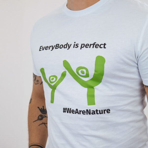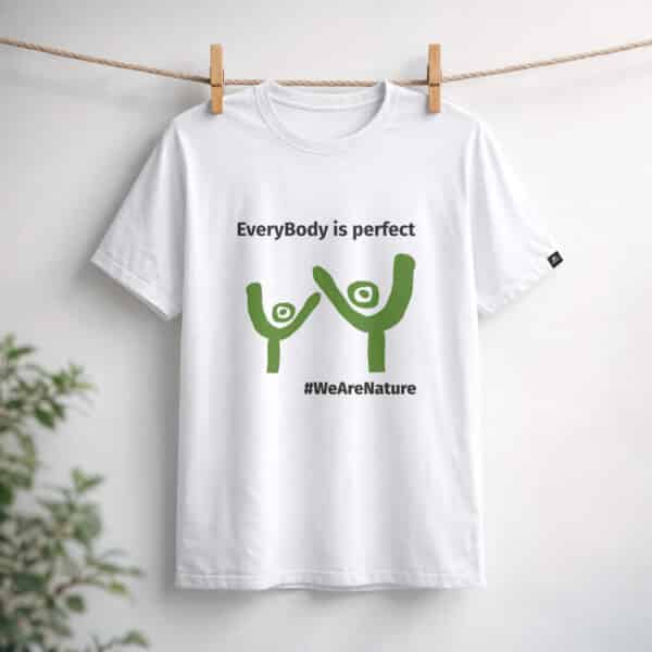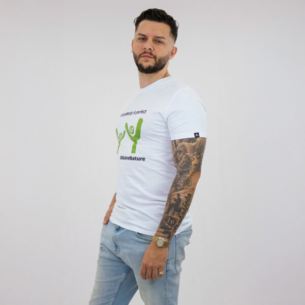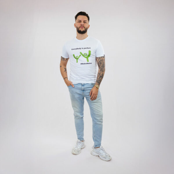 Bílé tričko s výraznou minimalistickou grafikou dvou zelených postav a nápisem „EveryBody is perfect.“ Navržené pro muže, kteří si cení sebevědomí a autenticity, toto tričko spojuje styl s jemným poselstvím o sebepřijetí.
