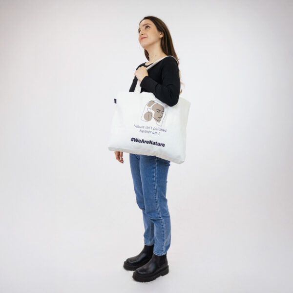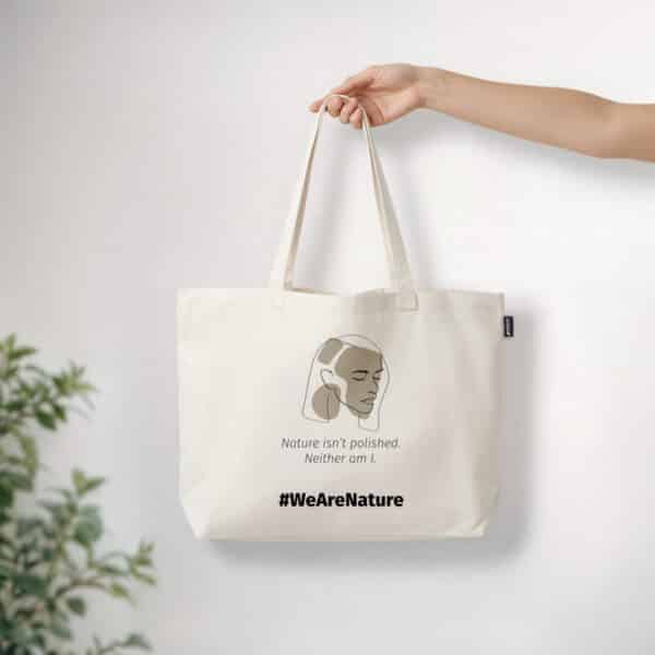 Nadčasová taška typu tote navržená pro nenucený styl a každodenní použití. Je potištěná zamyšleným sdělením „Příroda není dokonalá. Já také ne.“ spolu s minimalistickou liniovou kresbou klidné tváře a oslavuje autenticitu i přijetí přirozené krásy.