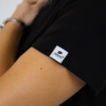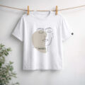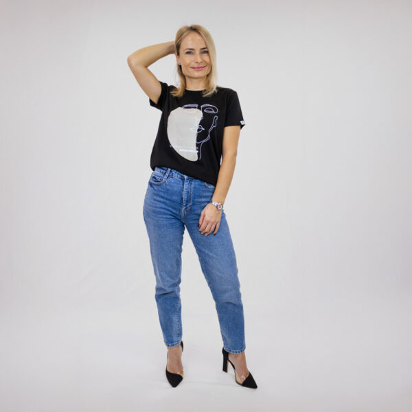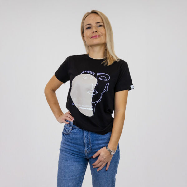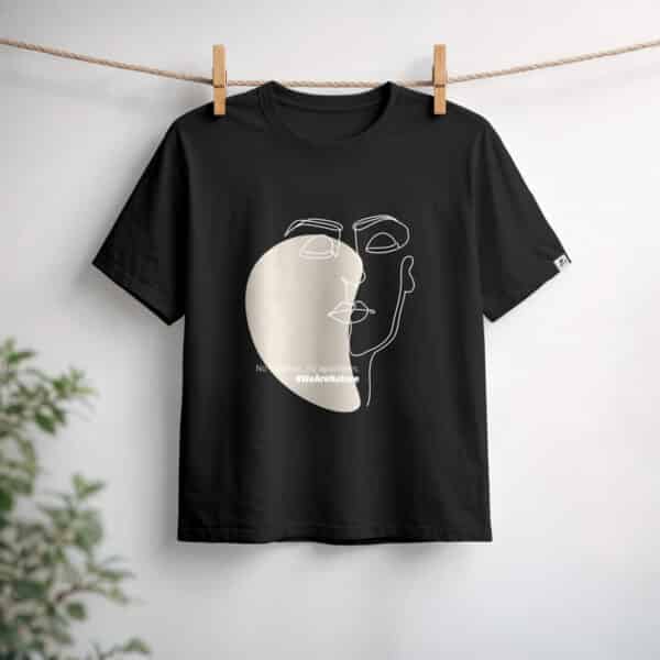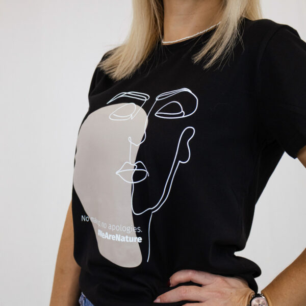 Minimalistické černé tričko s výrazným, a přitom vytříbeným uměleckým nádechem. S abstraktním obličejem vytvořeným liniovou kresbou v kombinaci s jemným neutrálním tvarem a nápisem „Bez make-upu, bez omluv.“ oslavuje přirozenou krásu a sebevědomí bez omluv.