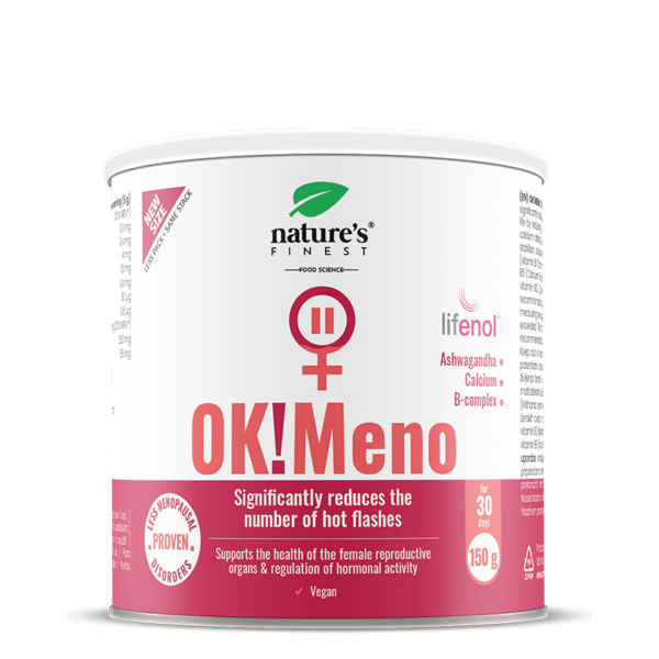 OK!Meno obsahuje patentovaný rostlinný extrakt Lifenol®, který zlepšuje kvalitu života žen v menopauze během 6 týdnů, protože výrazně snižuje četnost návalů horka a nočního pocení¹*. V kombinaci s ašvagandou, která podporuje duševní a nervovou rovnováhu a zmírňuje úzkost², poskytuje komplexní podporu.