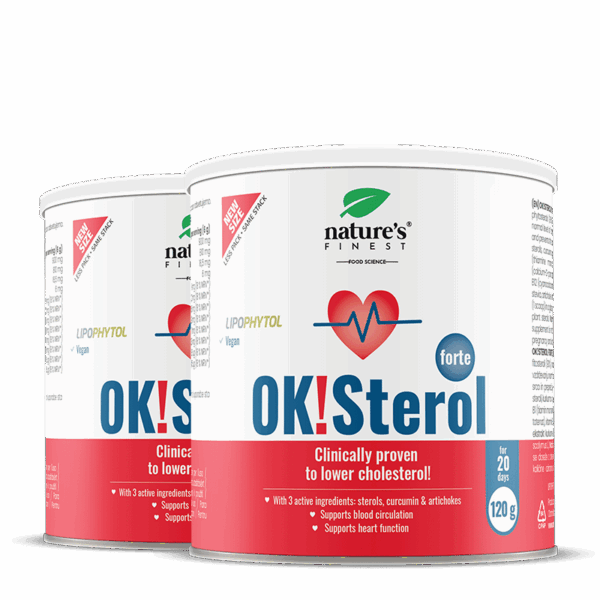 OK!Sterol Forte obsahuje patentovaný Lipophytol® s fytosteroly, které přispívají k udržení normální hladiny cholesterolu v krvi¹. Artyčok také pomáhá snižovat hladinu lipidů v krvi³, zatímco kurkuma podporuje zdraví srdce².