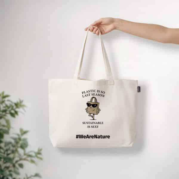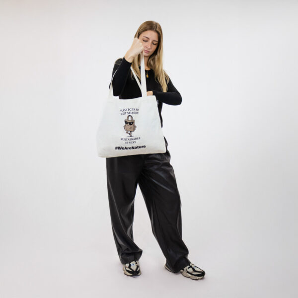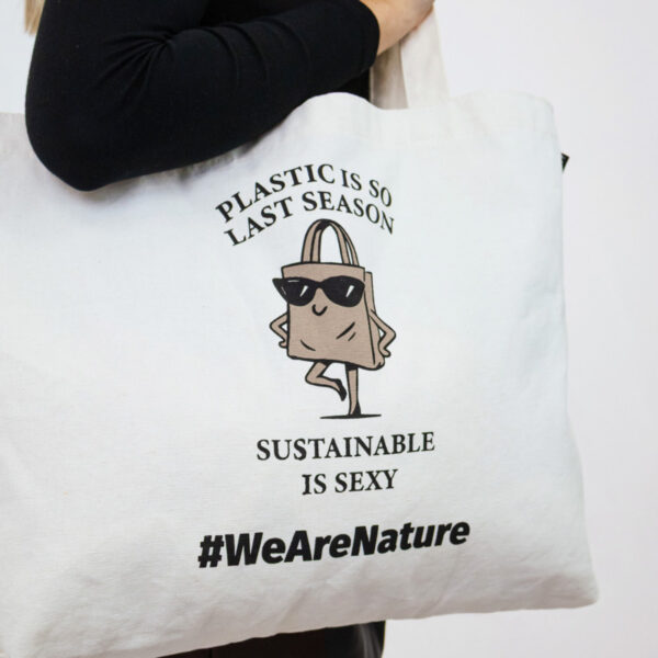 Nadčasová taška navržená pro každodenní styl s udržitelným přesahem. Je potištěná hravým nápisem „Plastic is so last season. Sustainable is sexy.“ a okouzlující ilustrací sebevědomé nákupní tašky ve slunečních brýlích, díky čemuž přináší humor a šmrnc do vědomého životního stylu.