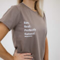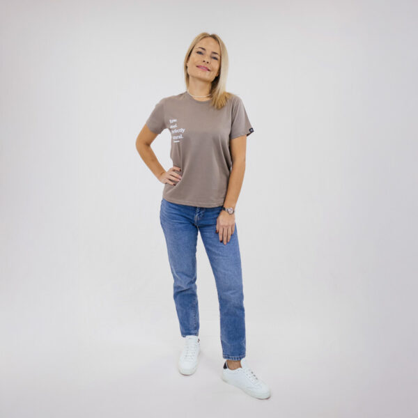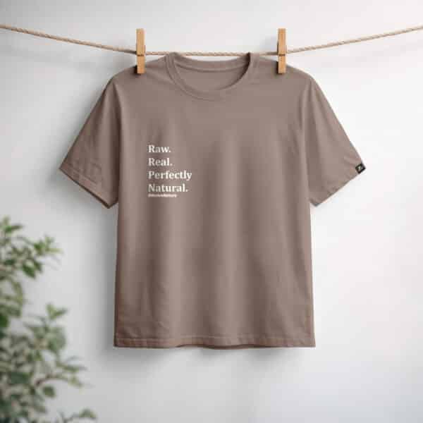 Minimalistické hnědé tričko navržené pro nenucený každodenní styl. S výrazným nápisem „Raw. Real. Perfectly. Natural.“ v čistě bílé potisku spojuje pohodlí s autentickým a sebevědomým přístupem.