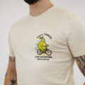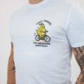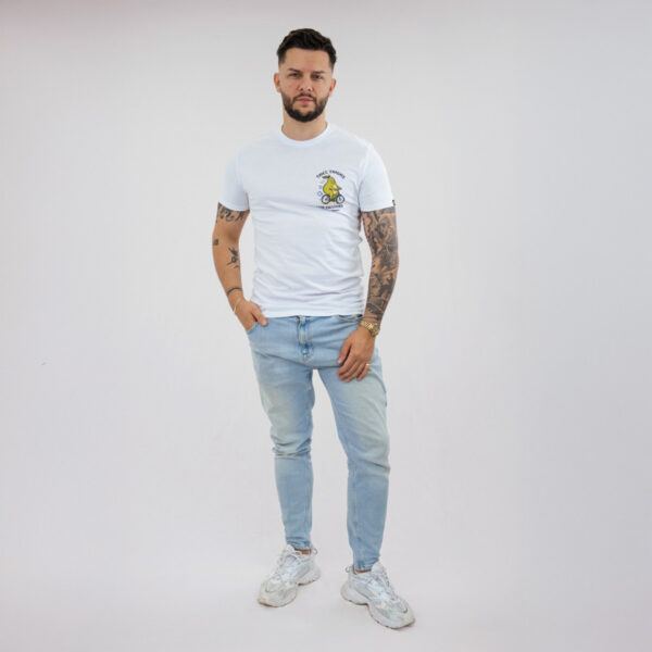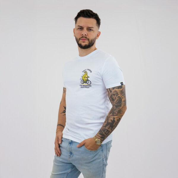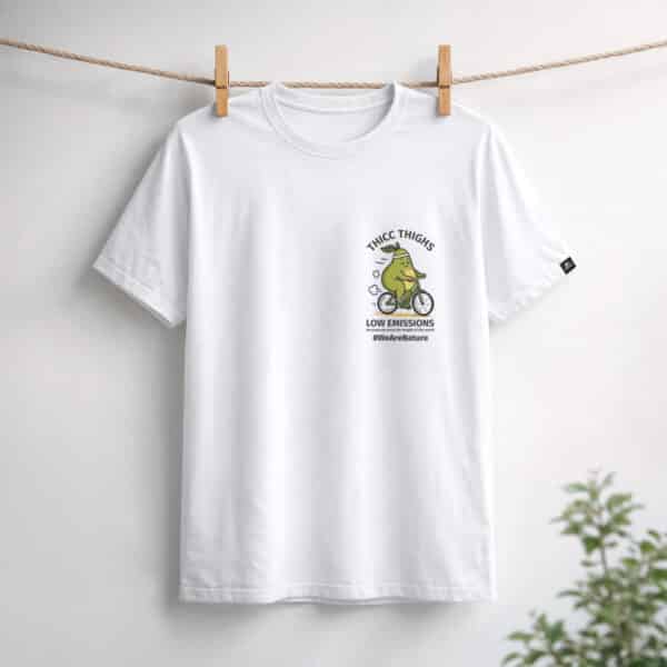 Bílé tričko navržené pro nenucený každodenní styl. Se sloganem „Thicc thighs, low emissions“ a hravou grafikou avokáda na kole oslavuje sebevědomí, sebelásku a vědomý způsob života.