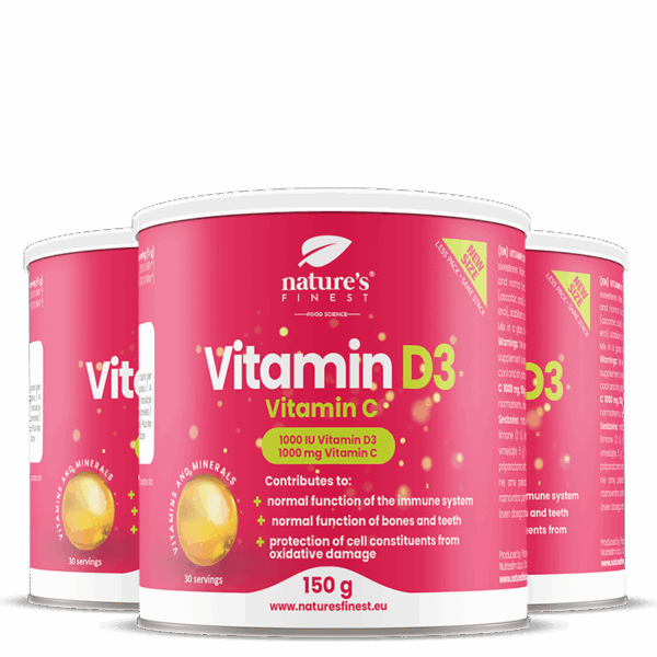 S vitamínem D3 a vitamínem C v prášku poskytujeme nejlepší absorpci, která začíná, jakmile se dostane do styku s našimi slinami. Primární úlohou vitamínu D je udržování homeostázy a konstantní plazmatické koncentrace vápníku, fosfátů a vitamín C, který působí jako silný antioxidant.