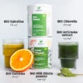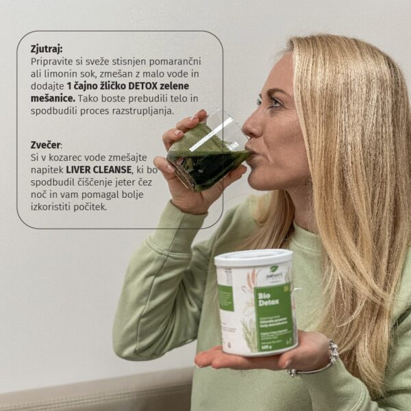 Ráno rozmíchejte 1 lžičku (5g) DETOX zelené směsi v čerstvě vymačkané pomerančové nebo citronové šťávě smíchané s vodou a vypijte. To probudí tělo a stimuluje detoxikaci.